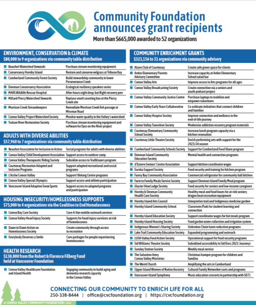 The Comox Valley Community Foundation is celebrating the 52 community service organizations who received a total of $665,000 in grants this year, with a special April 17 section of the Comox Valley Record newspaper.